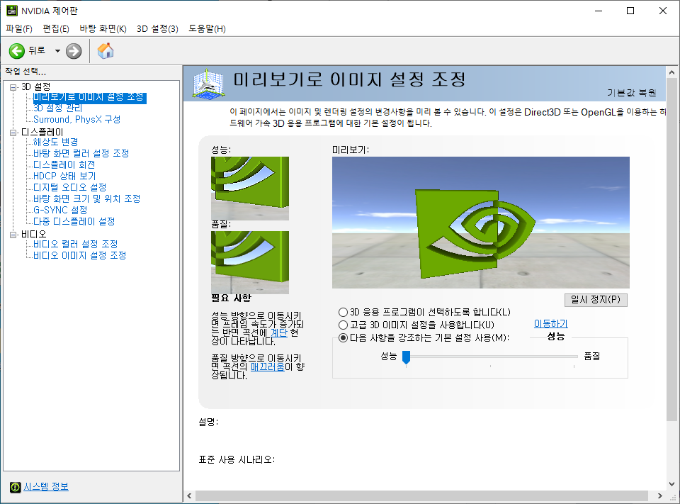 성능 쪽으로 최대한 당겨서 설정해 주신 후에 오른쪽 아래 적용버튼을 눌러줍니다.