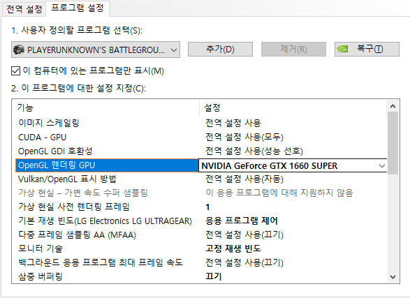 배틀그라운드 프로그램을 찾아서 추가해 주신 다음 아래와 같이 하나씩 설정을 변경해 주시면 됩니다.